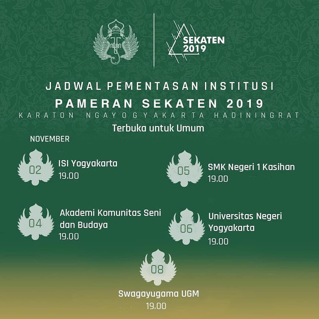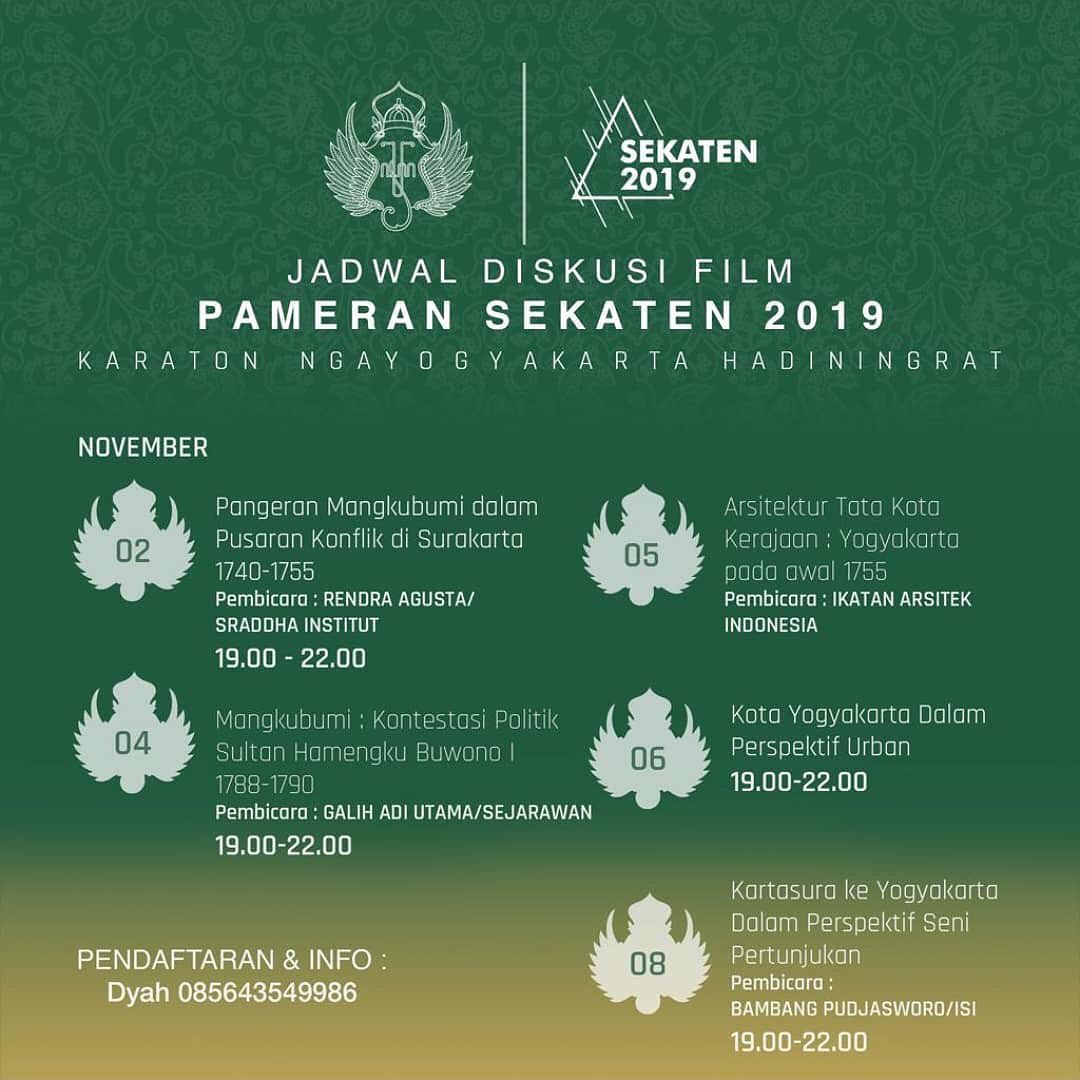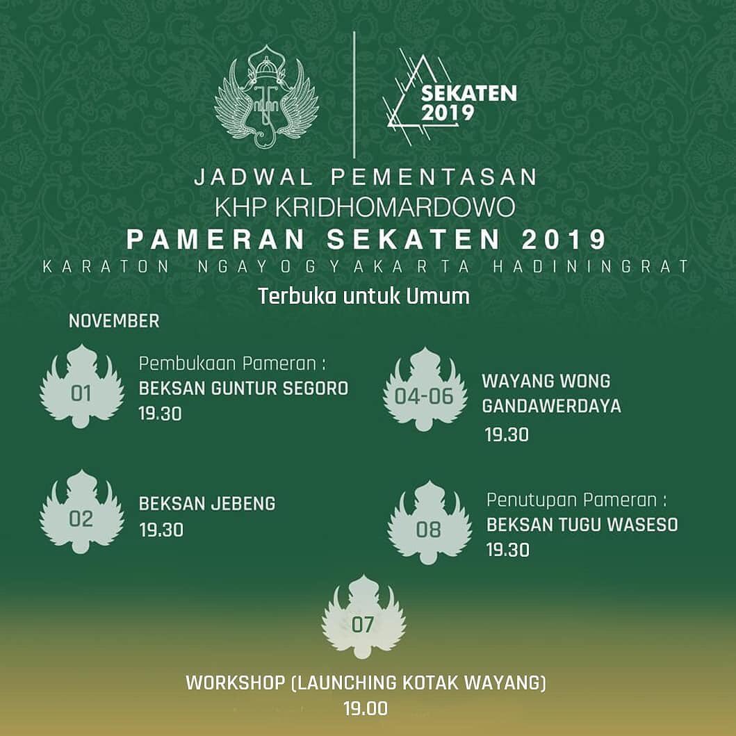 Rangkaian pameran akan diisi dengan pameran koleksi, Workshop, Pelatihan Seni, Diskusi Film, Perlombaan Karawitan yang berlangsung selama 1-9 November 2019 di Bangsal Pagelaran dan Kompleks Sitihinggil Keraton Yogyakarta. Juga akan berlangsung kegiatan Pengajian di Masjid Gedhe selama Sekaten berlangsung