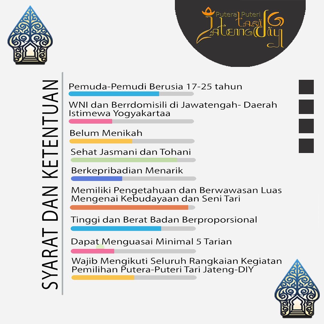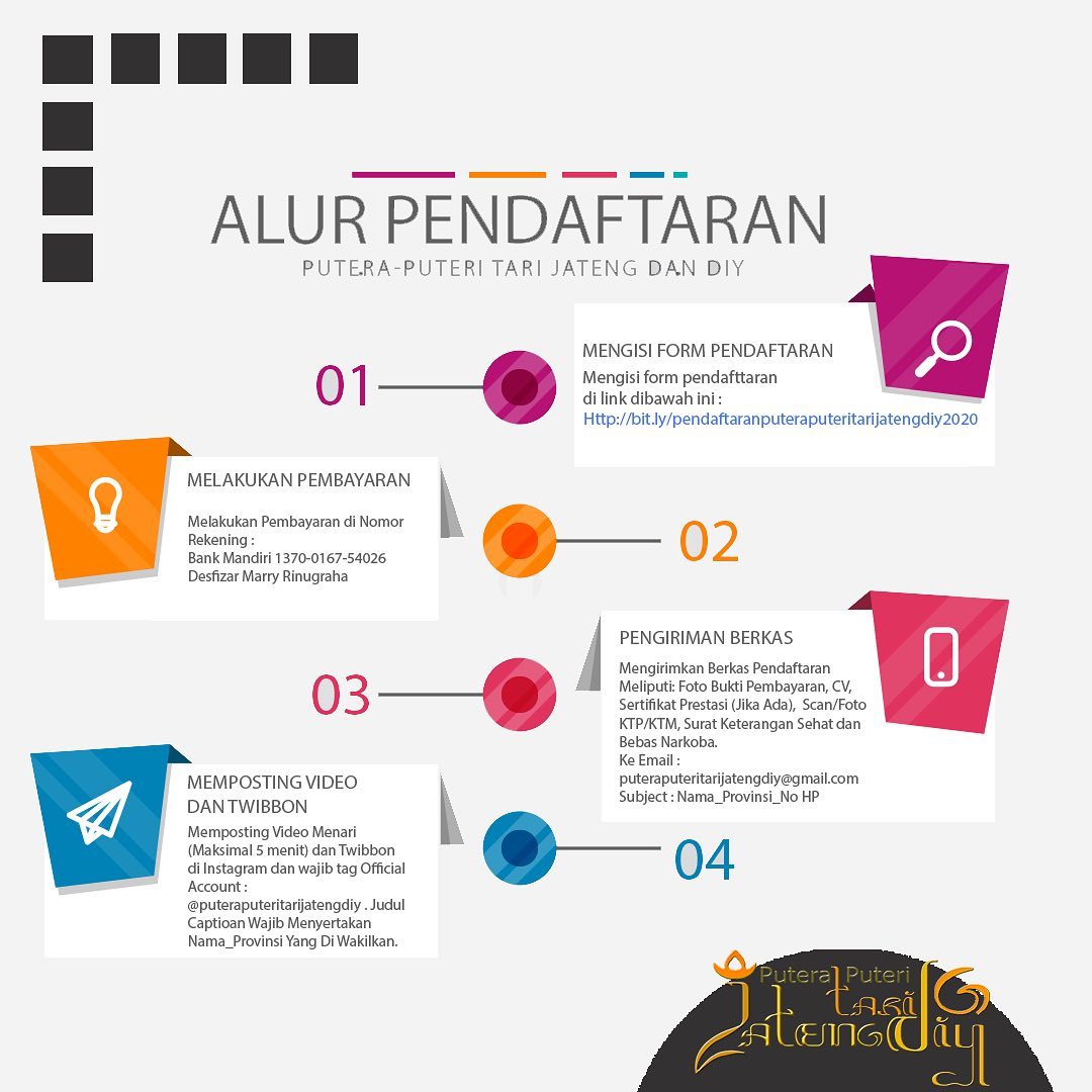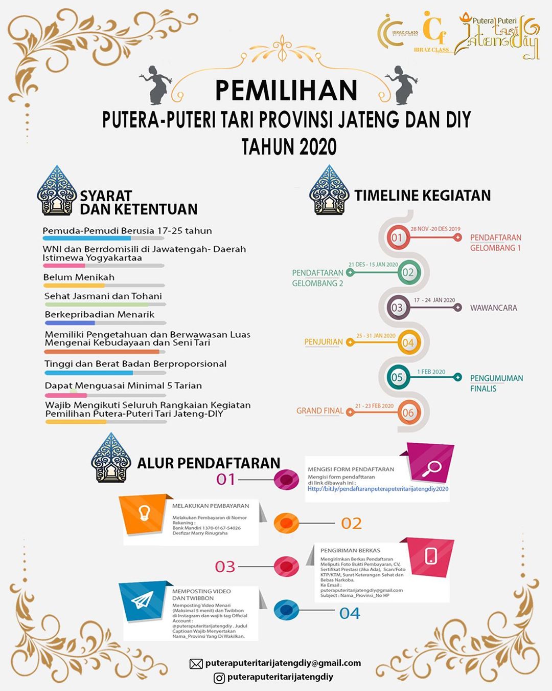 Persiapkan segala persyaratannya, pendaftaran ini dibuka untuk dua gelombang. Saatnya buktikan dan jadilah Putera Puteri Tari Jateng dan DIY 2020